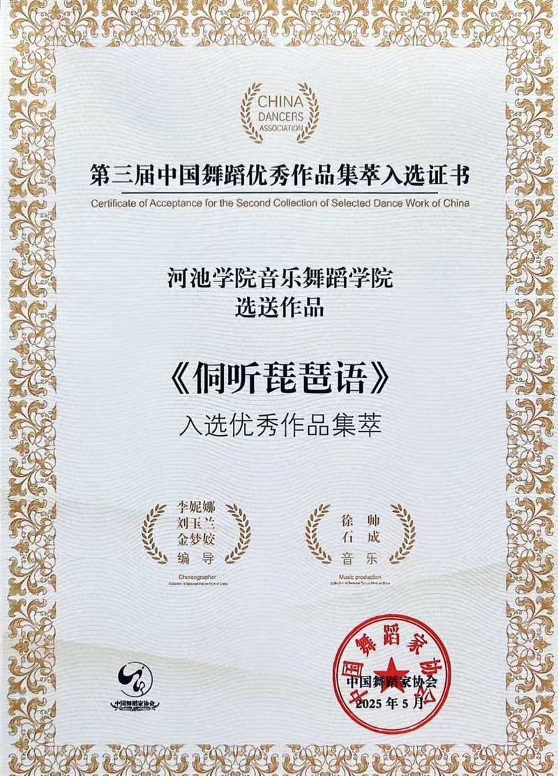 《侗听琵琶语》入选第三届中国舞蹈优秀作品集萃证书。