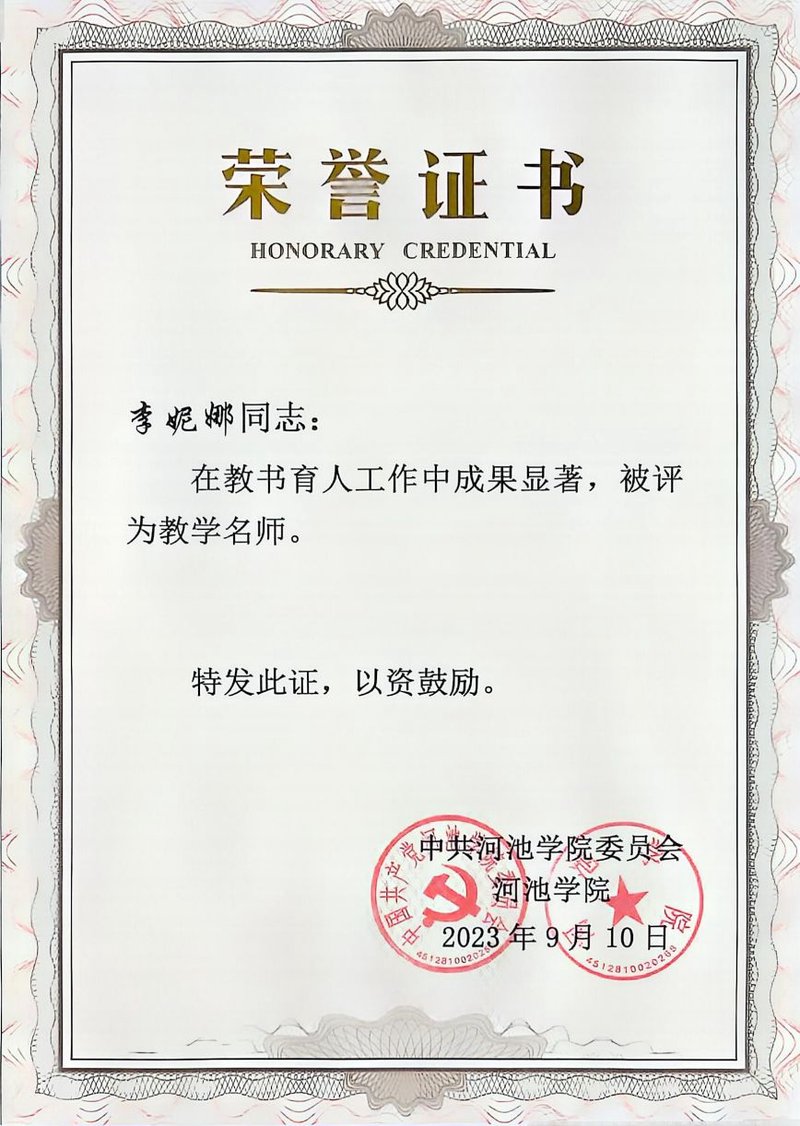 18年来,李妮娜培养和指导的学生超过2000人。2023年教师节,李妮娜获评河池学院“教学名师”。这份荣誉,是对她坚守的见证。