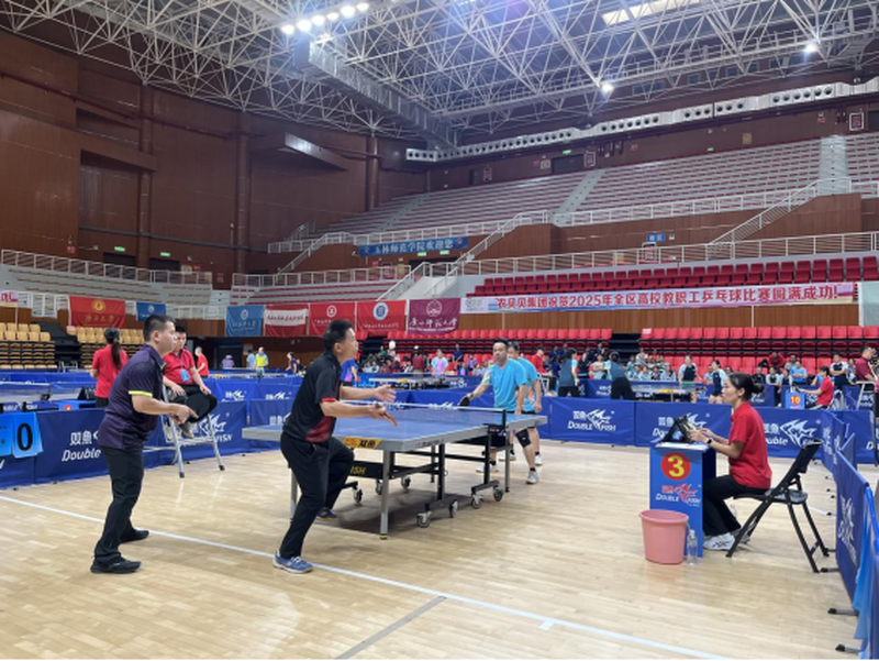 近日,由广西壮族自治区教育厅主办、玉林师范学院承办的2025年广西高校教职工乒乓球比赛在玉林师范学院体育馆开赛。全区31所高校代表队共360余名运动员参赛。经过3天激烈角逐,我校教职工乒乓球队团结协助,不畏强手,顽强拼搏,成功闯入八强,最终获得混合团体第七名的好成绩,并荣获体育道德风尚奖。(作者:张钱伟 拍摄:赵丹 校对:韦鹏 审核:蓝色)