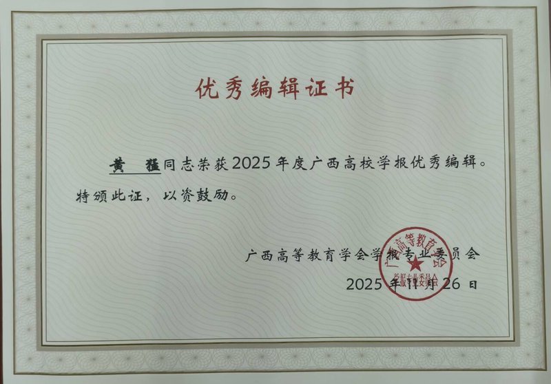 在本次评优活动中,我校喜获多项荣誉。其中,《河池学院学报》被评为2024-2025年度广西高校精品期刊,学报主编覃拥灵被评为2025年度广西高校学报优秀主编,学报编辑黄猛被评为2025年度广西高校学报优秀编辑。