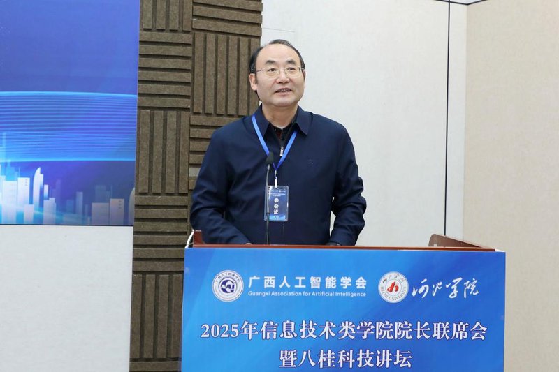 12月6日,由广西人工智能学会主办、我校承办的2025年信息技术类学院院长联席会暨八桂科技讲坛在我校开幕。本次论坛以“数融壮乡 智启新章”为主题,汇聚了来自政府、高校和企业的专家学者,共同探讨人工智能赋能壮乡振兴的新路径,书写广西人工智能事业的新篇章。广西人工智能学会理事长元昌安,学校党委书记甘毅,河池市委常委、副市长陈志杰出席并致辞。开幕式由学校党委常委、组织部部长、数字战略发展研究院院长易云飞主持。