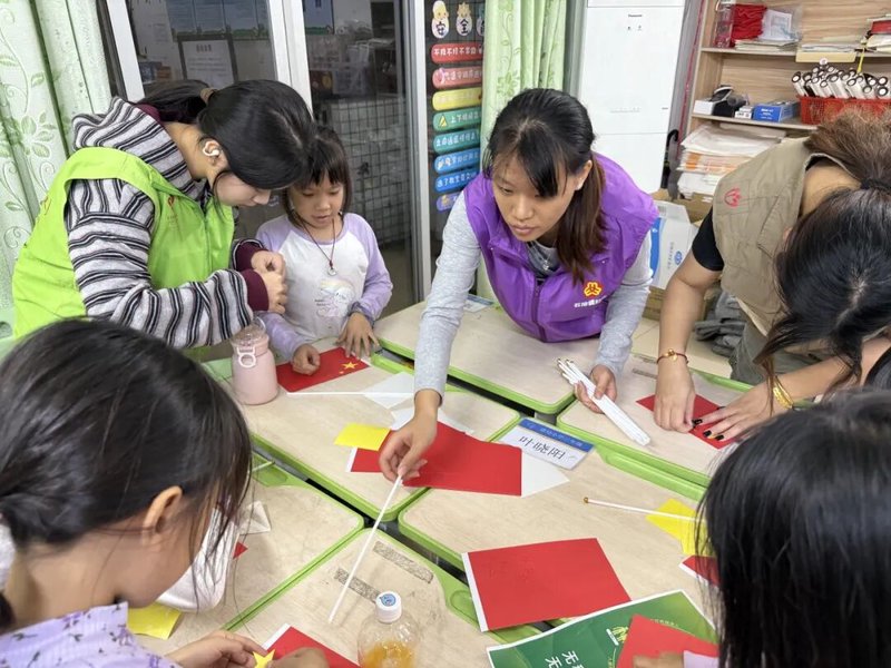 ▲图为孩子们与志愿者老师共同制作红旗