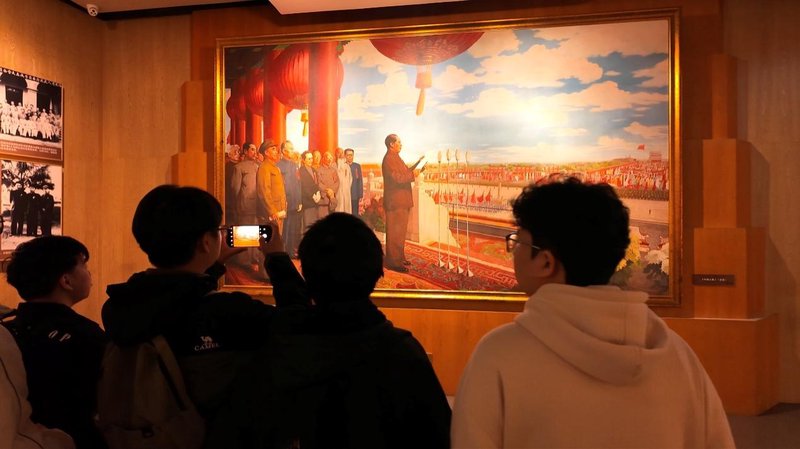 图为队员举着手机拍摄开国大典主题画作。王家炜 供图