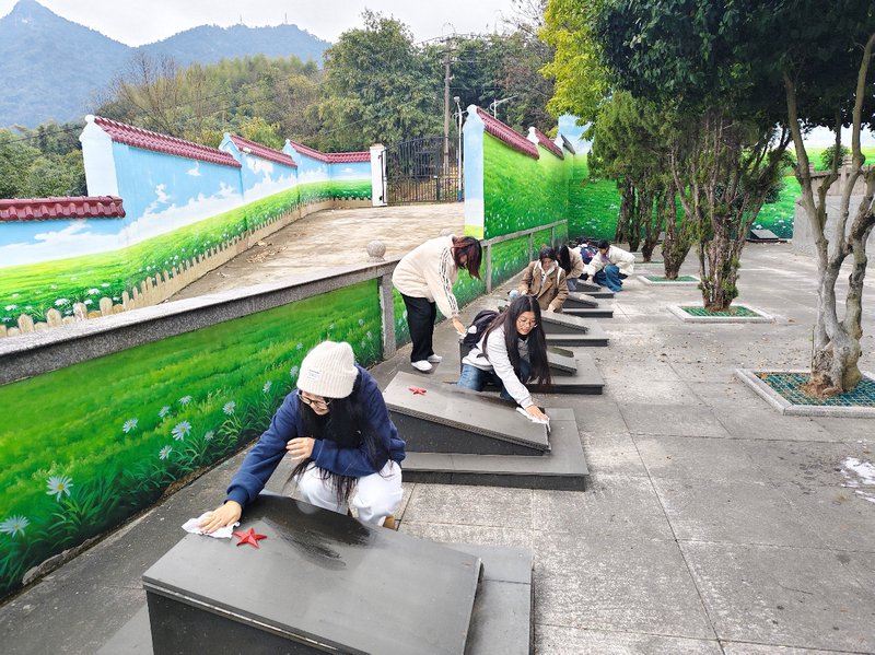 图为实践队队员仔细擦拭烈士墓。庄筱悠 供图