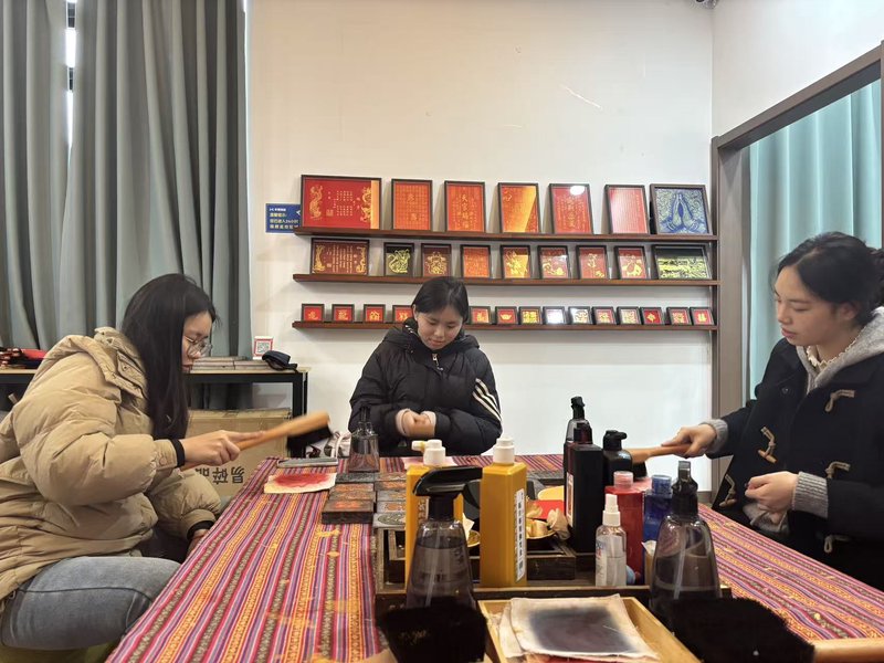 2月2日,团队走进重庆市非遗体验中心。剪纸在红纸上绽开巧思,花丝镶嵌的方寸间流转光泽,艾草的清香弥漫古韵,拓印让石碑上的文字悄然苏醒,香水文化则融合古今,芬香中承载着中华文明的智慧与风骨。每一门手艺,都是一部可触可感的“活历史”。