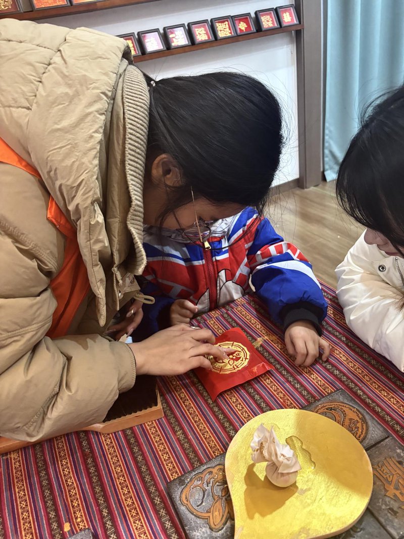 2月3日,队员们换上志愿者标识,在体验区引导游客尝试拓印与花丝镶嵌。从“学”到“教”,身份的转变让他们对传承有了更切实的体会。当看到游客——尤其是孩子们在完成作品时眼中闪烁的光芒,他们真切感受到,每一次成功的体验,都可能是非遗传承的星星之火。