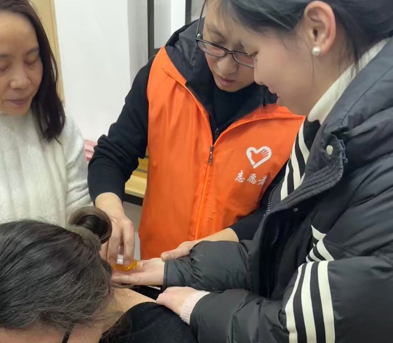 图为实践成员贺星宇向指导老师学习艾草精油手法