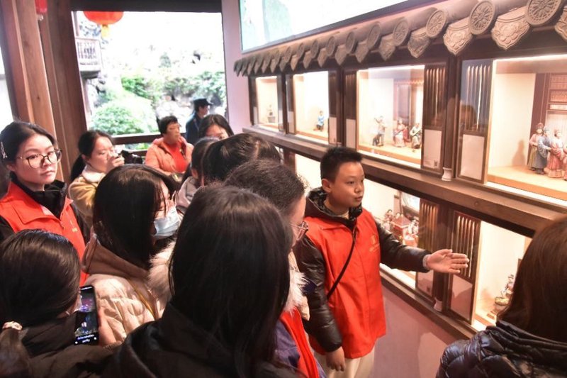 【图为林驰带领实践队员参观馆内微缩景观,讲述非遗故事。林超颖摄】