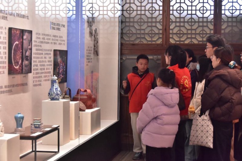在饮食文化展区,林驰重点介绍了福州传统食补习俗。他指着展柜中的文字资料介绍,福州人历来重视“药食同源”,在立春、冬至等重要节气,民间习惯将党参、枸杞、当归等中药材与家禽或海鲜同炖。在陶瓷与漆器交错的展厅里,林驰将目光锁定在一组描绘闽都岁时节令的展品上。他并未机械地背诵讲解词,而是从福州人骨子里的“依食为天”说起。从冬至的“搓米时”到立春的“咬春”,从佛跳墙的渊源到寻常巷陌里的红糟肉,少年的叙述逻辑清晰,将复杂的民俗知识拆解得生动有趣。