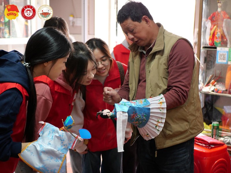 (图为实践队队员向周老师学习布袋木偶戏 林诗彤供图)