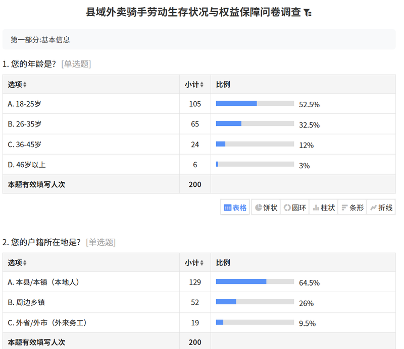 在四县实地走访的基础上,团队发放并回收了200份有效问卷。问卷数据明晰县域外卖骑手劳动生存状况以及权益保障问题。