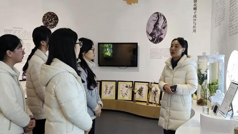 为系统梳理金银花产业发展历程,团队走进平邑金银花博物馆开展沉浸式研学。该馆由国药集团投资建设,以金银花“过去、现在、未来”为主线,集中展示了2000余年的栽培历史、品种改良成果与加工工艺演进。在讲解员引导下,队员们深入了解《神农本草经》《本草纲目》等典籍记载,观摩从土炕烘干到智能杀青的工艺变革。
