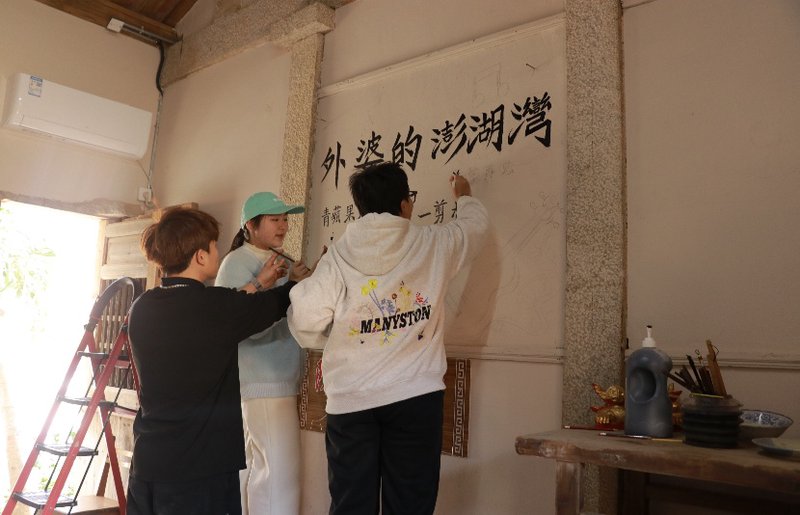 实践团走进围头村“红娘客栈”,主理人卢昕橙讲述了“围头新娘”的故事——148桩跨越海峡的婚姻,使这里成为名副其实的“两岸通婚第一村”。她将民宿经营为情谊的“中转站”、烟火的“温暖客厅”。成员们在聆听故事之余,亲身参与民宿环境维护,清除杂草、协助备餐,在锅碗瓢盆的日常声响中体悟到“两岸融合就藏于一餐一饭的寻常烟火”。此外,成员们共同甄选并手书《外婆的澎湖湾》《一剪梅》等承载两岸共同记忆的歌曲,装饰于民宿墙面,并以“隔海相牵”为主题创作大型墙绘,将抽象情感转化为可触可感的文化印记。