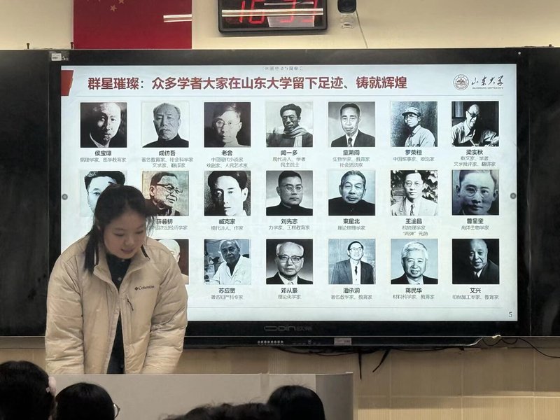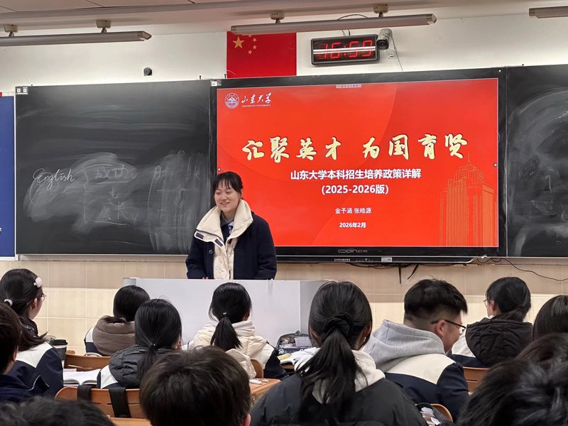 进班交流环节,金同学详细介绍了山东大学的概况与招生政策,也向学弟学妹们分享了自己作为文科生的学习经验。